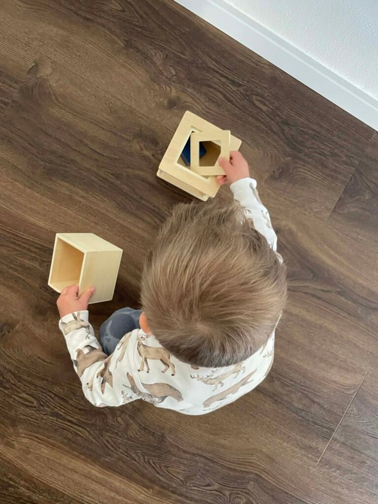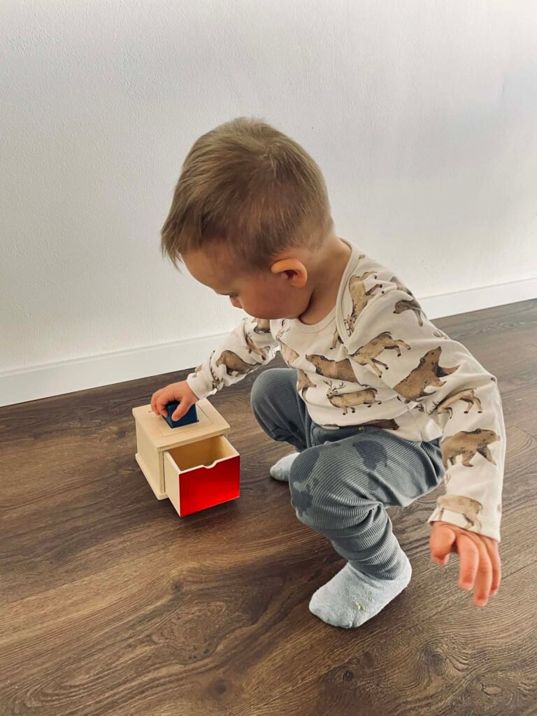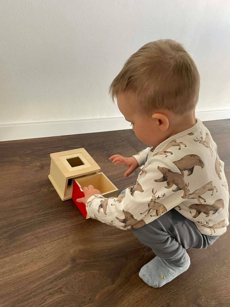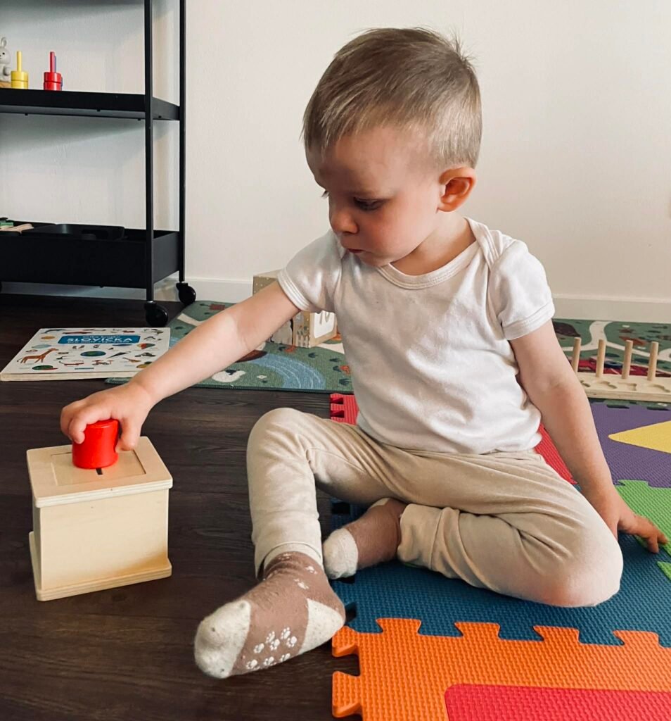 Co je na této hračce skvělé je, že se jednotlivé desky dají vyměnit a hračka tak roste s dítětem i jeho zájmem. Náš Theodor začal na vkládání žetonů, což mu vydrželo téměř 6 měsíců. Později se rozhodl pro vkládání krychle a válce, kde měl možnost navnímat rozdílnou velikost i hmotnost vkládaných předmětů, čímž u dítěte dochází k rozvoji předmatematické dovednosti. Theodor se k ní vrací – sám a pakovaně. To je pro mě jako pedagožku i mámu ten nejlepší důkaz, že hračka dává smysl.