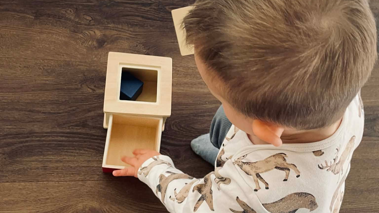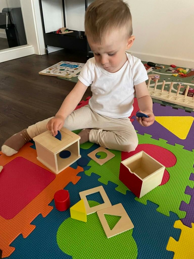 V batolecím věku si náš syn nejvíce oblíbil Montessori box na vkládání tvarů. Na první pohled to není nic převratného — dřevěný box, desky s otvory a několik tvarů různých barev (válec, krychle, trojúhelník a žeton).